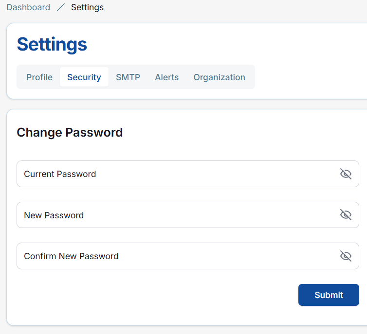 The Security section allows users to change their password by entering the current password, new password, and confirming it. Users can also enable Two-Factor Authentication (2FA) for added account protection.