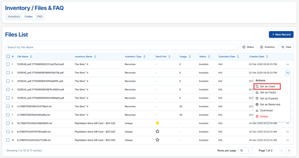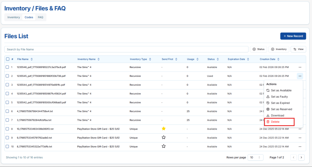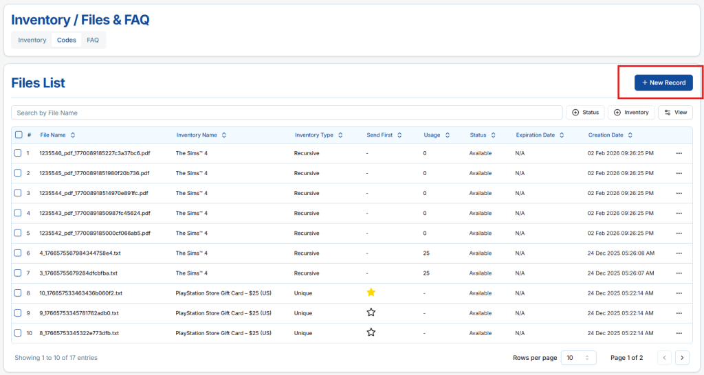 The Files List displays all files that are added and allocated to inventory items in the DFSENDER platform. These files represent the actual digital content that can be available for delivery or delivered to customers based on their current status. Each file is linked to a specific inventory item and is managed directly from this section, allowing sellers to monitor availability, usage, and delivery priority. Inventory files may include text files, digital codes or keys (such as game keys or license keys), PDF documents, images, audio files, ZIP archives, and other supported digital file formats.