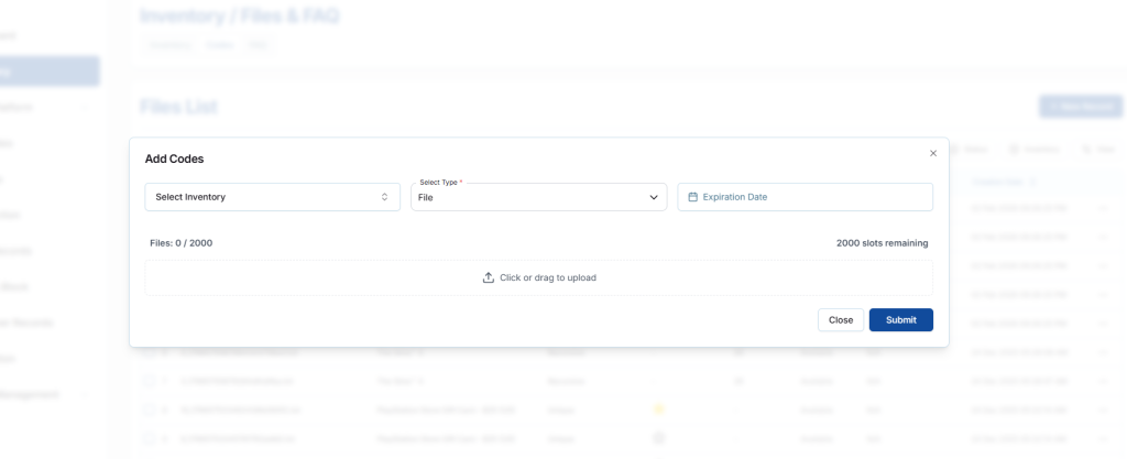 Once the files or text entries are submitted, they will be added to the selected inventory and become available for management and delivery. This process ensures sellers can efficiently upload and organize large numbers of digital products with ease.