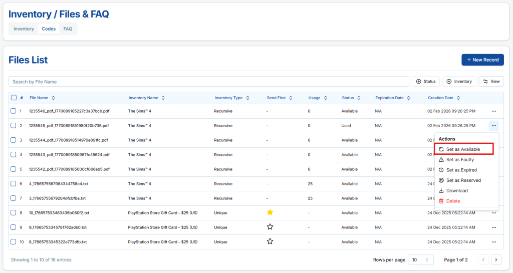 - Sellers can set a file as Available even if it was previously marked as Used, Expired, or Faulty, Reserved it to active status for delivery.
