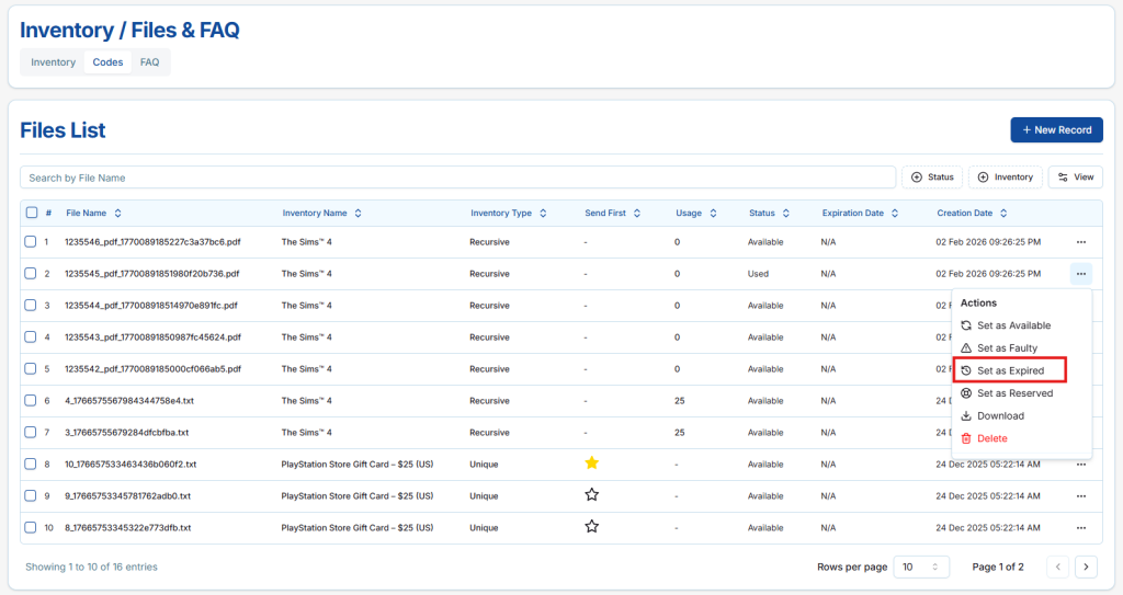 - Sellers can mark a file as Expired regardless of its current status (Used, Available, Faulty, or Reserved).