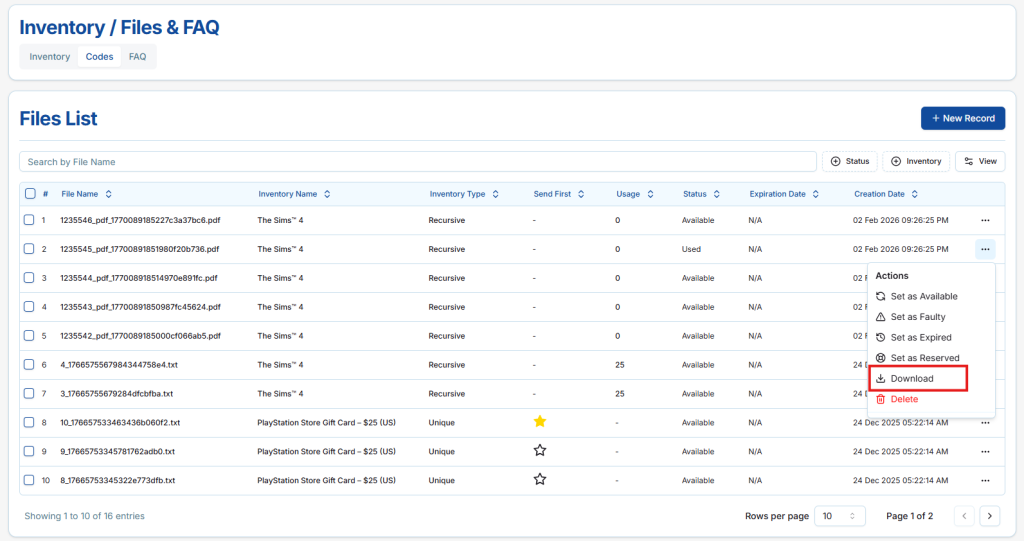 - Sellers can download files regardless of their current status (Available, Used, Faulty, Expired, or Reserved).
