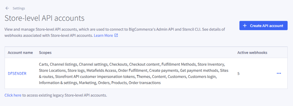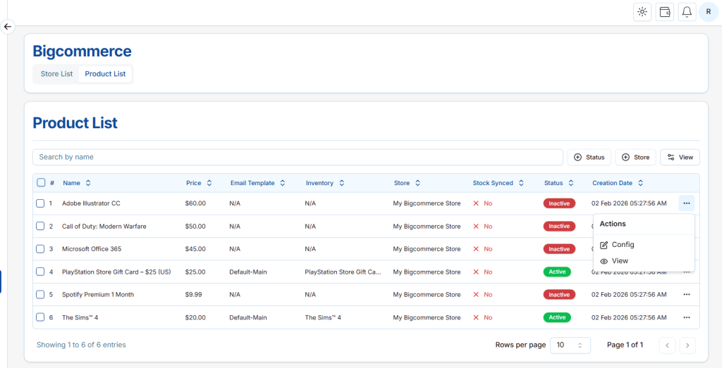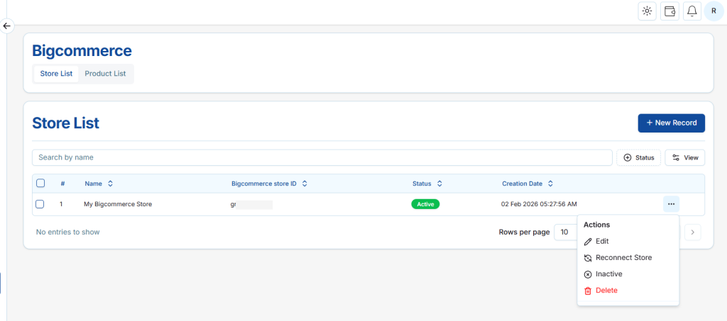- Delete → Remove store (Deleting store will also remove all related transactions and products. All related webhooks are automatically removed from BigCommerce)