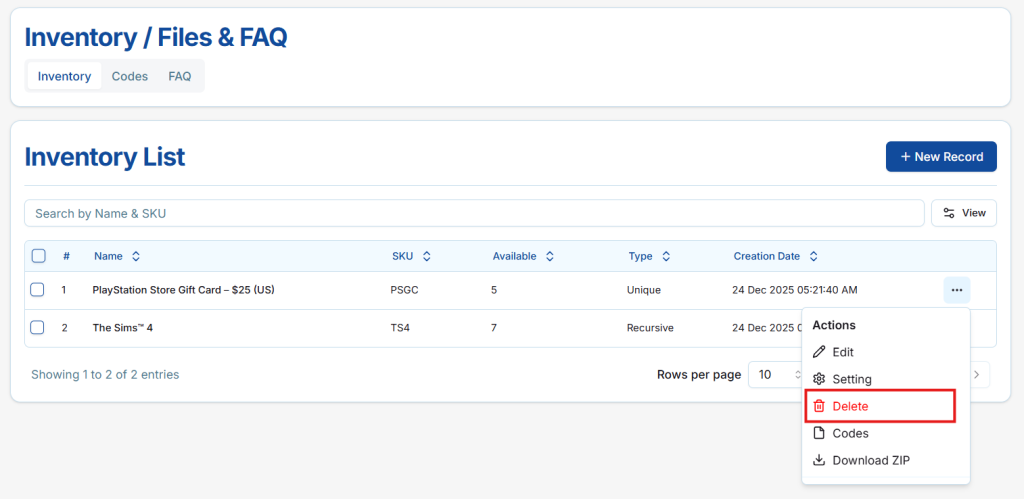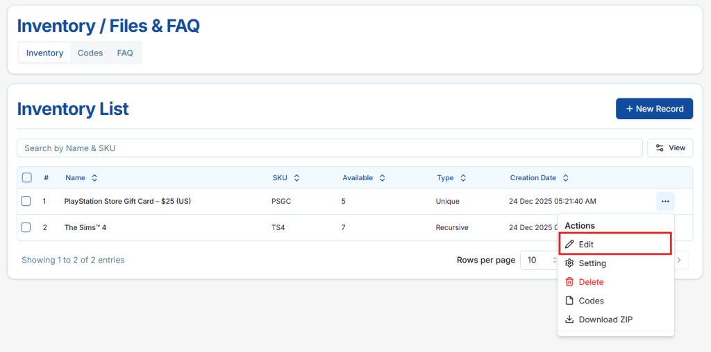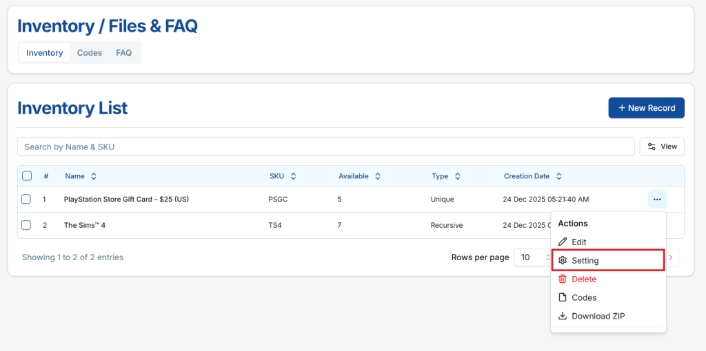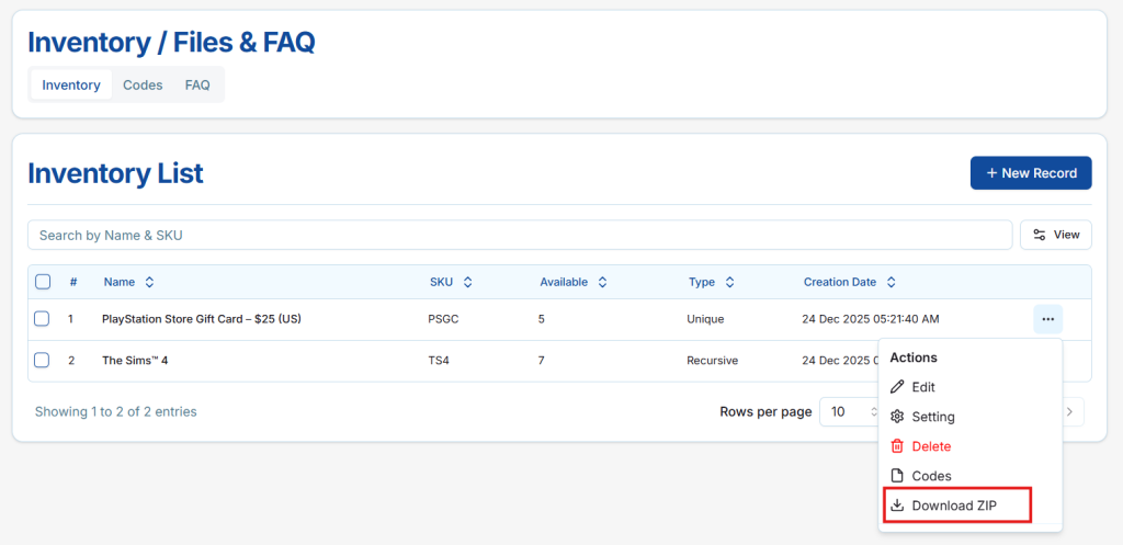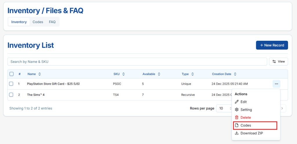 Here, sellers can view, manage, and download all codes or files associated with the inventory item efficiently.