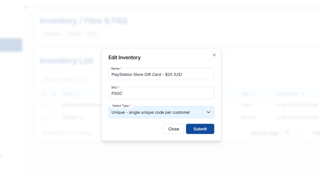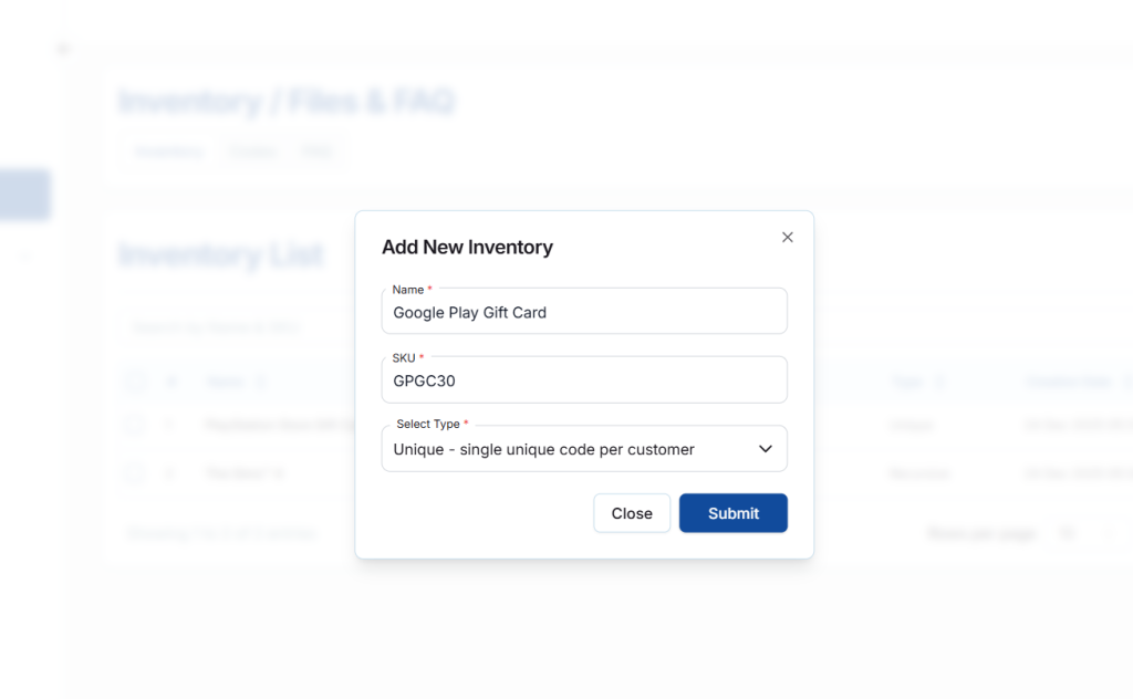 Once all required details are filled and conditions are met, the new inventory item will be created successfully. Understanding Unique and Recursive codes ensures proper delivery of digital products to customers. With this, the process of adding a new inventory item is complete.
