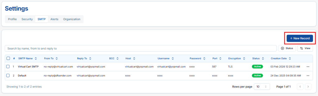 the SMTP section. Here, you will find a button labeled New Record.