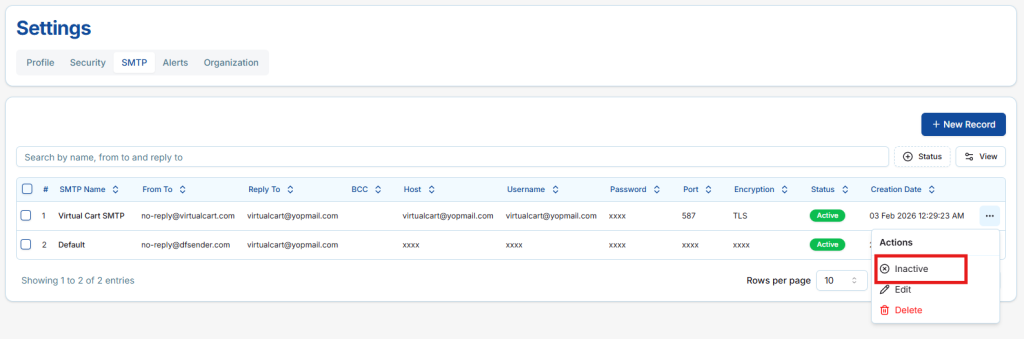 From the SMTP list, find the SMTP you want to active or inactive.