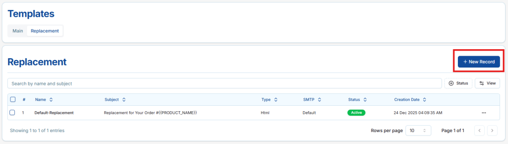 The Replacement Email Templates section manages system-generated emails sent to customers for order replacement notifications. These templates are redesignable, allowing sellers to customize the layout and content for consistent, professional communication.