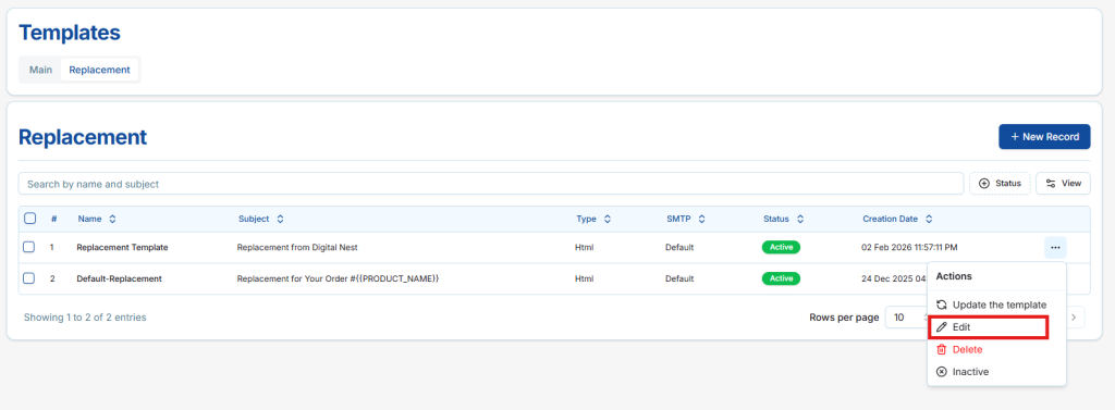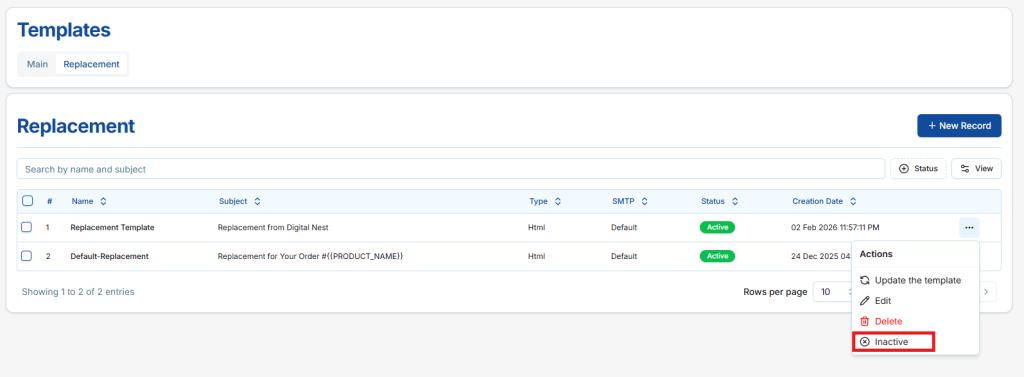 Sellers can activate or inactivate existing Main Email Templates to control whether they are sent to customers. Active templates are automatically sent for order replacement emails, while Inactive templates are disabled and will not be sent.