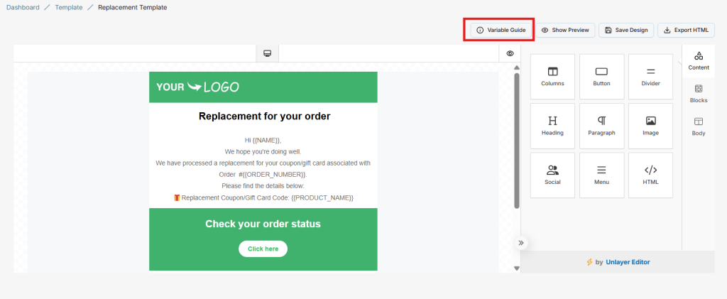 From the Update Template, click Variable Guide button a popup will appear.