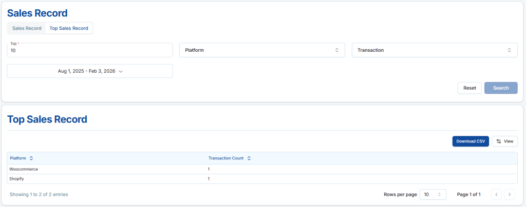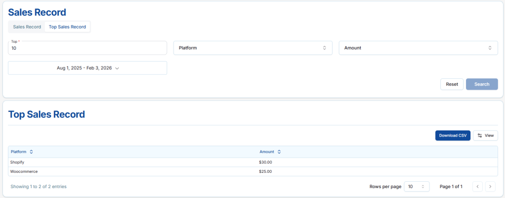 The Top Sales Record feature allows sellers to identify their best-performing segments within the DFSENDER platform. This tool provides insights into which platforms, stores, products, or customers are generating the most revenue or transactions.